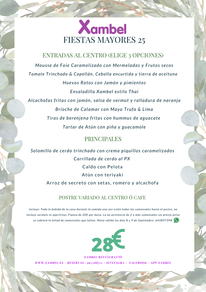 En Xambel queremos celebrar con vosotros las Fiestas Mayores de nuestra ciudad con un menú pensado para compartir momentos especiales en torno a la mesa. Una propuesta gastronómica que combina tradición, sabor mediterráneo y nuestro toque creativo.